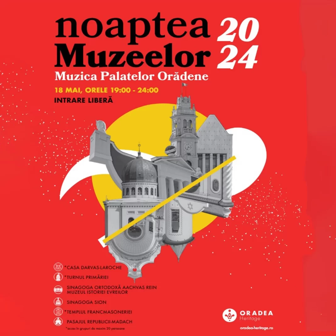 Pe 18 mai, între orele 19.00-24.00, obiectivele turistice își deschid porţile cu acces gratuit pentru toţi vizitatorii. Ediţia din acest an a evenimentului stă sub semnul muzicii – Muzica Palatelor Orădene.